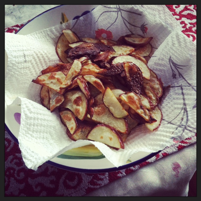 There are a plethora of healthy chip recipes out on the internet.  I have tried probably about half of them and usually end up with a soggy pile of potatoes that no one could even generously call potato chips.  I set out to try and figure out what the secret trick was to make crispy and yummy chips.  I think that I got pretty close, not exactly like a bag of Lays, but pretty close.  I will say that you might want a few special tools to make sure you get as close to a store bought potato chip as possible.  These two tools are a Silpat and a mandoline.  The Silpat really helps so that your potato slices don’t stick to the pan while you are cooking them, but if you don’t have one parchment paper can work as well.  The mandoline helps to slice the potato very thin, which is uber important to a crispy chip.  If you don’t have a mandoline, you can use a regular knife.  Just make sure to cut the potatoes as thin as possible.  Alright enough talking, let’s make some chips!