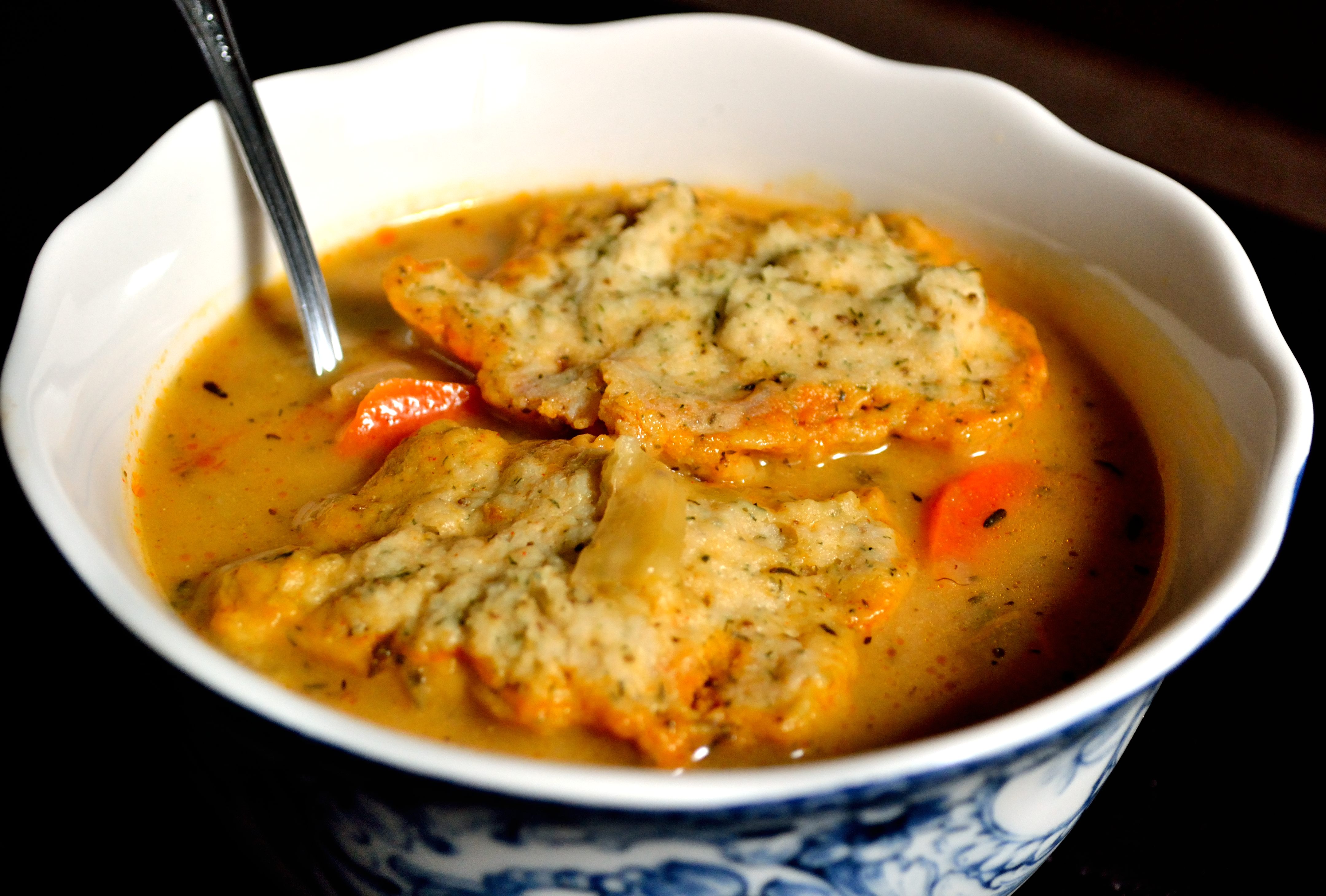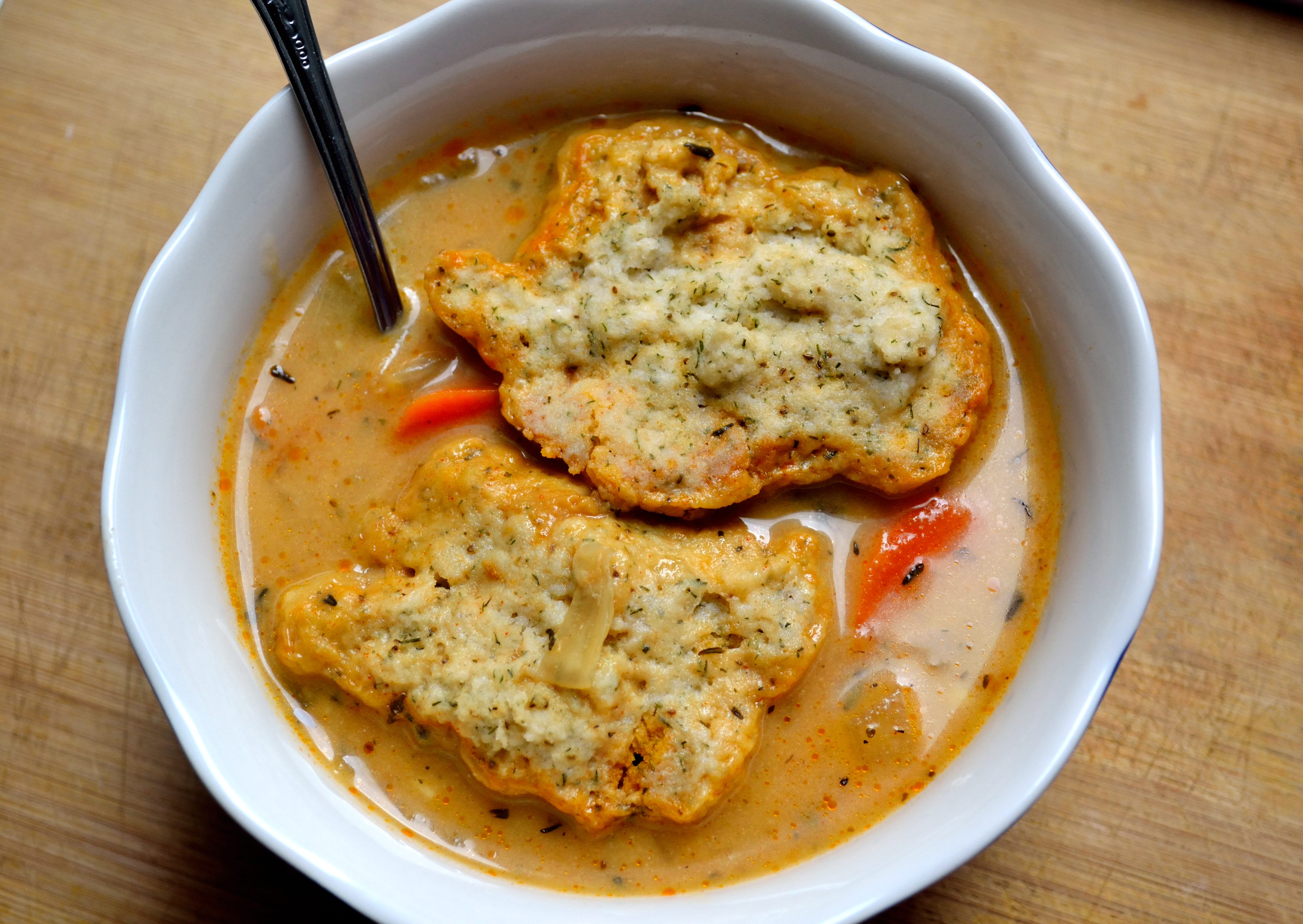 3. Uncover the soup and drop spoonfuls of the dumpling dough into the soup. Once the batter is gone, cover the sip with a lid and leave for 20 minutes. DON’T lift the lid during this time to check the dumplings because that will lengthen your cook time. At the end of the 20 minutes uncover and check dumplings. They should be fluffy and a little brown around the edges. If some of the dumplings have fused together just break apart with a wooden spoon.
