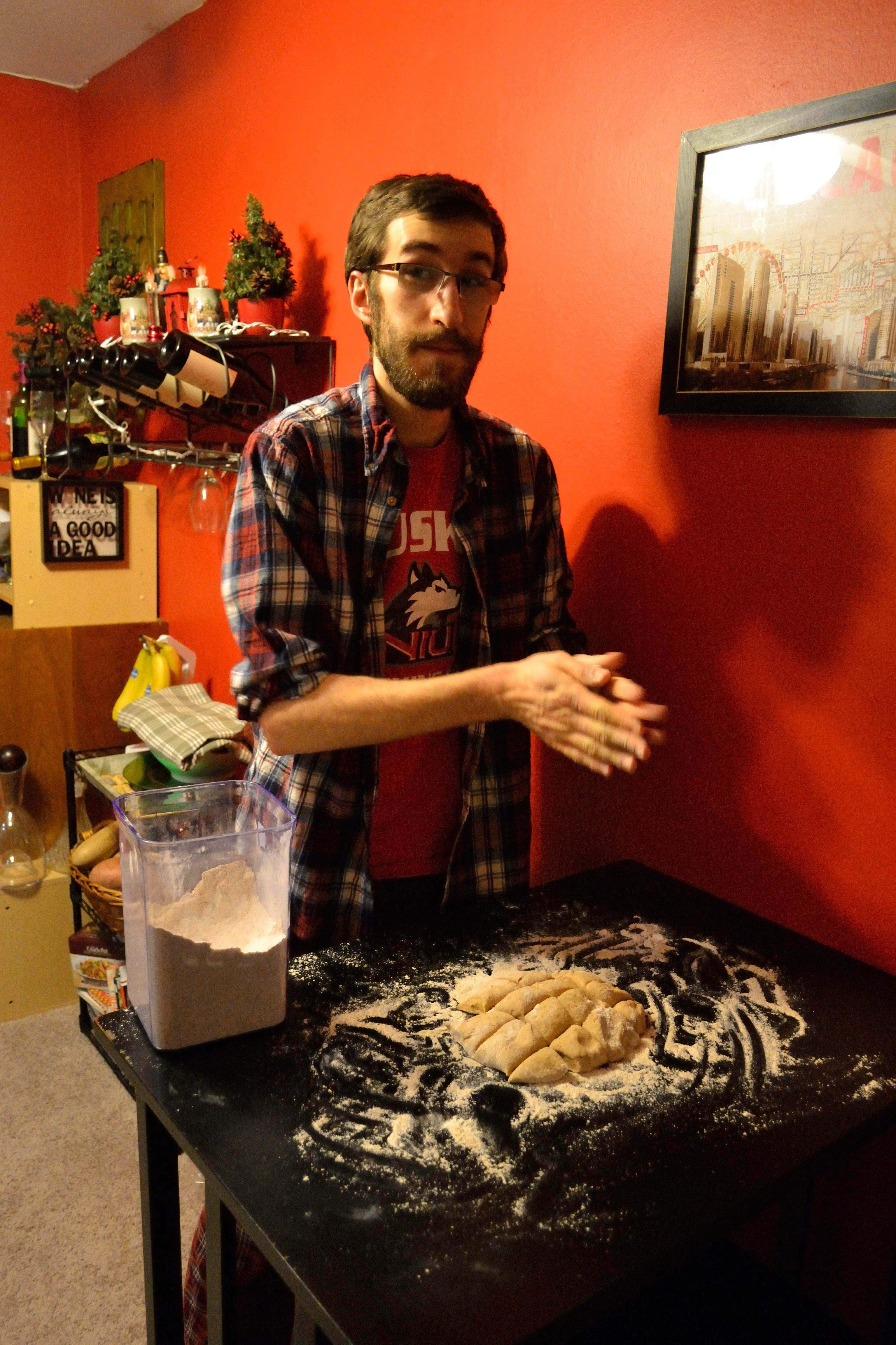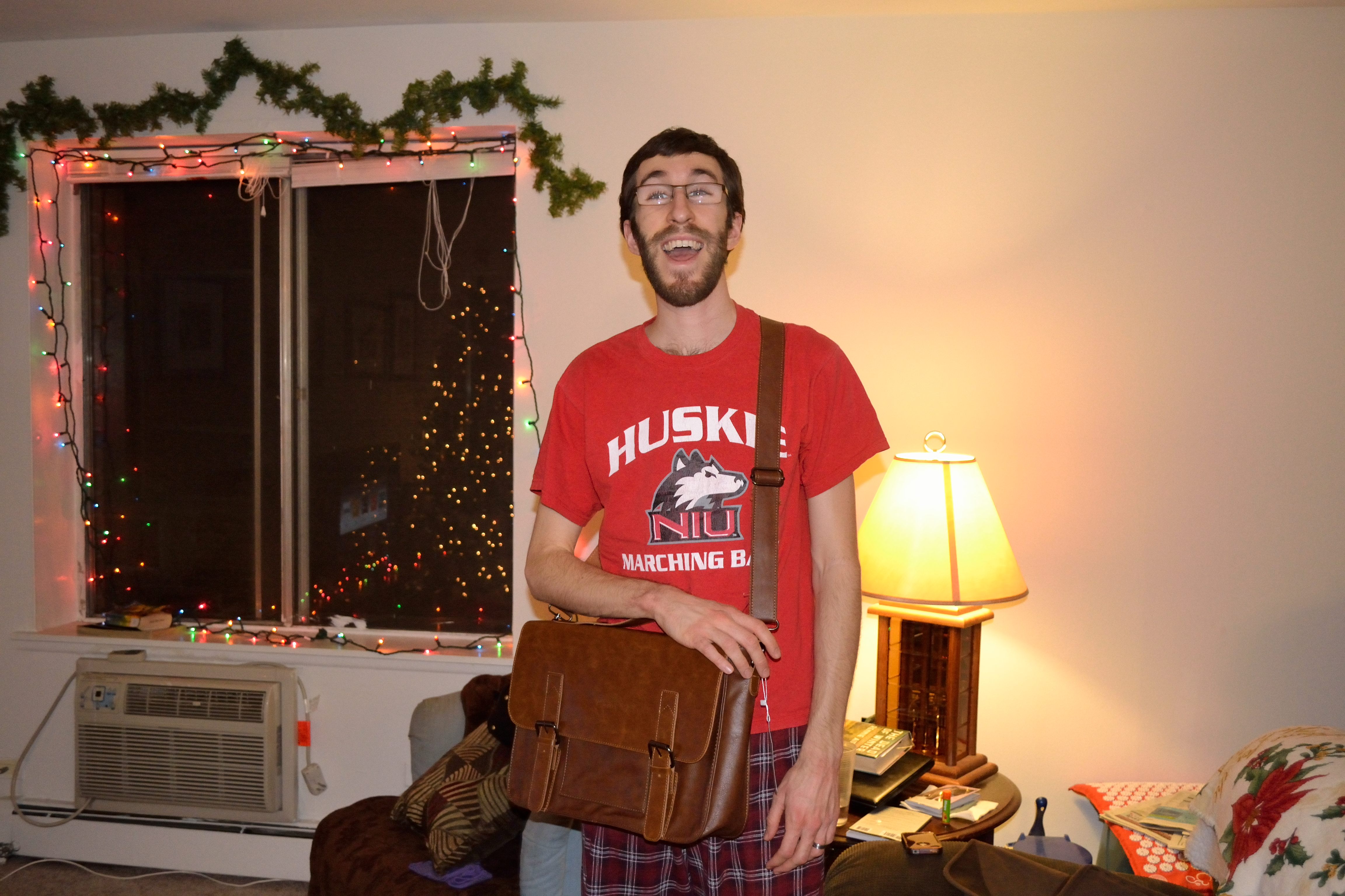 He’s pretty adorable. Us humans open our presents over the course of the day. Every time we start a new Christmas movie we open another present. I would say that this year was a good year for both of us. Adam got a new beard trimmer, a t-shirt, books, and candy. I got a new teapot, oven mitts, and books/cookbook. Apparently we both think alike because our big gifts to each other were new bags. I got Adam a new leather messenger bag for work so he could look all fancy and professional and he got me an awesome new black purse that is much better than the bright orange paisley tote bag that I have been using for the past few months.