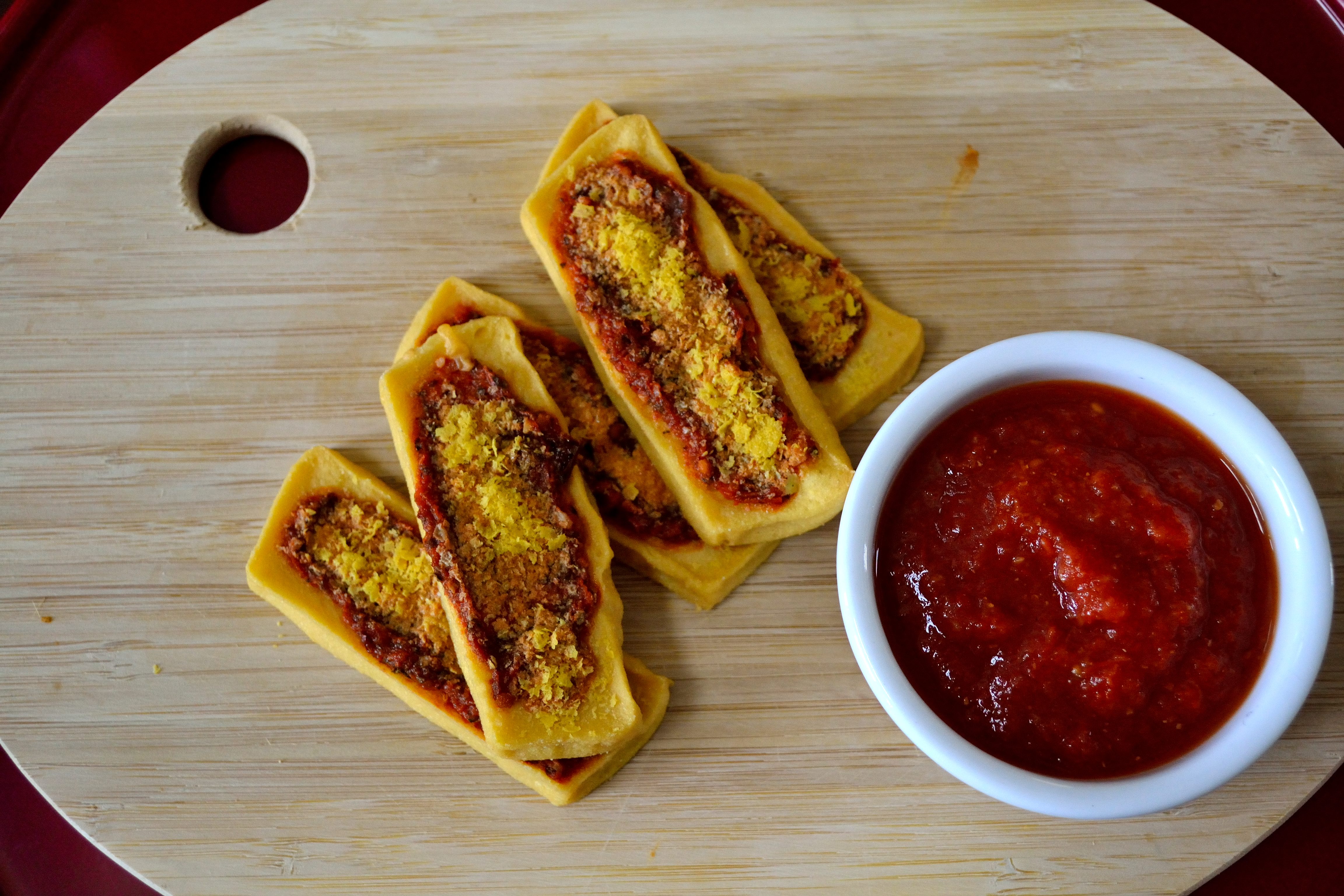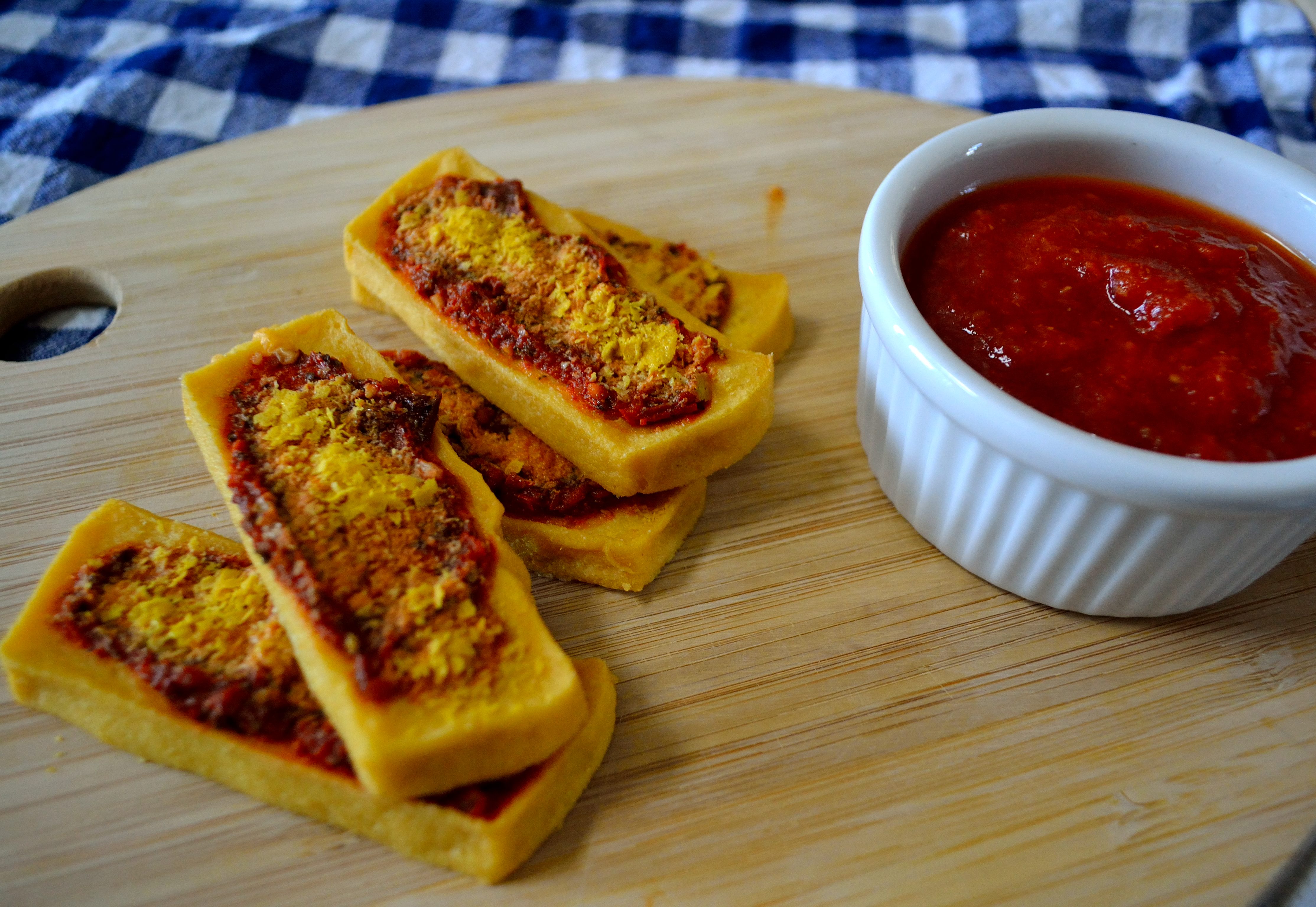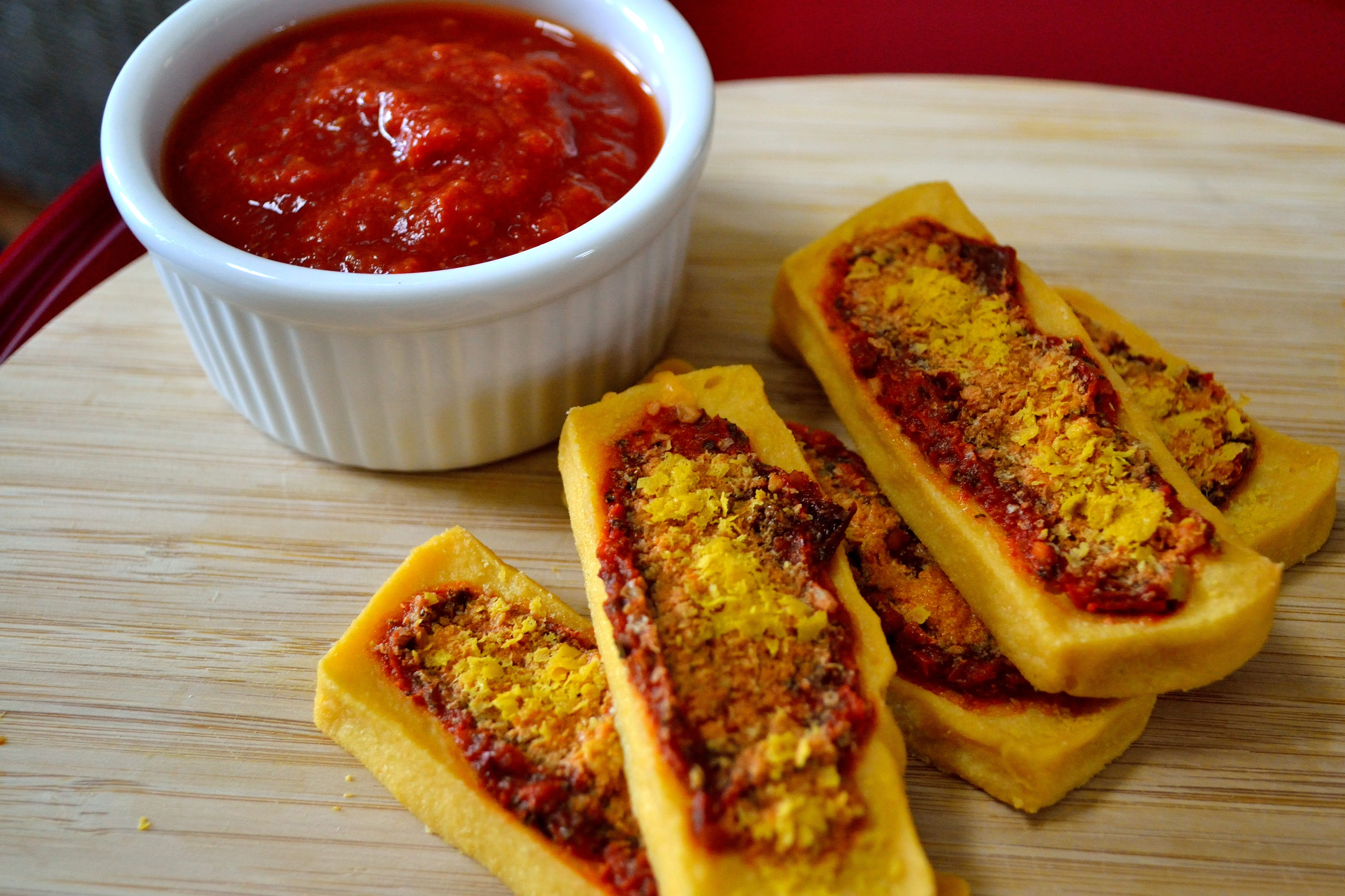 Today’s recipe was kind of a spur of the moment idea. I was trying to think of something different to do with my chickpea tofu and somehow pizza popped into my head. It was easy to put together and makes a really great snack or appetizer. I made some with regular cheese for Adam and used nutritional yeast for mine. We devoured these as we watched the season premier of Game of Thrones. Because I was still housesitting at that point, we were able to watch on a big screen with surround sound and it was amazing. It was also the first time that we were able to watch the season premier on the actual day that it premiered. It was quite the night and these little bites made it even better.