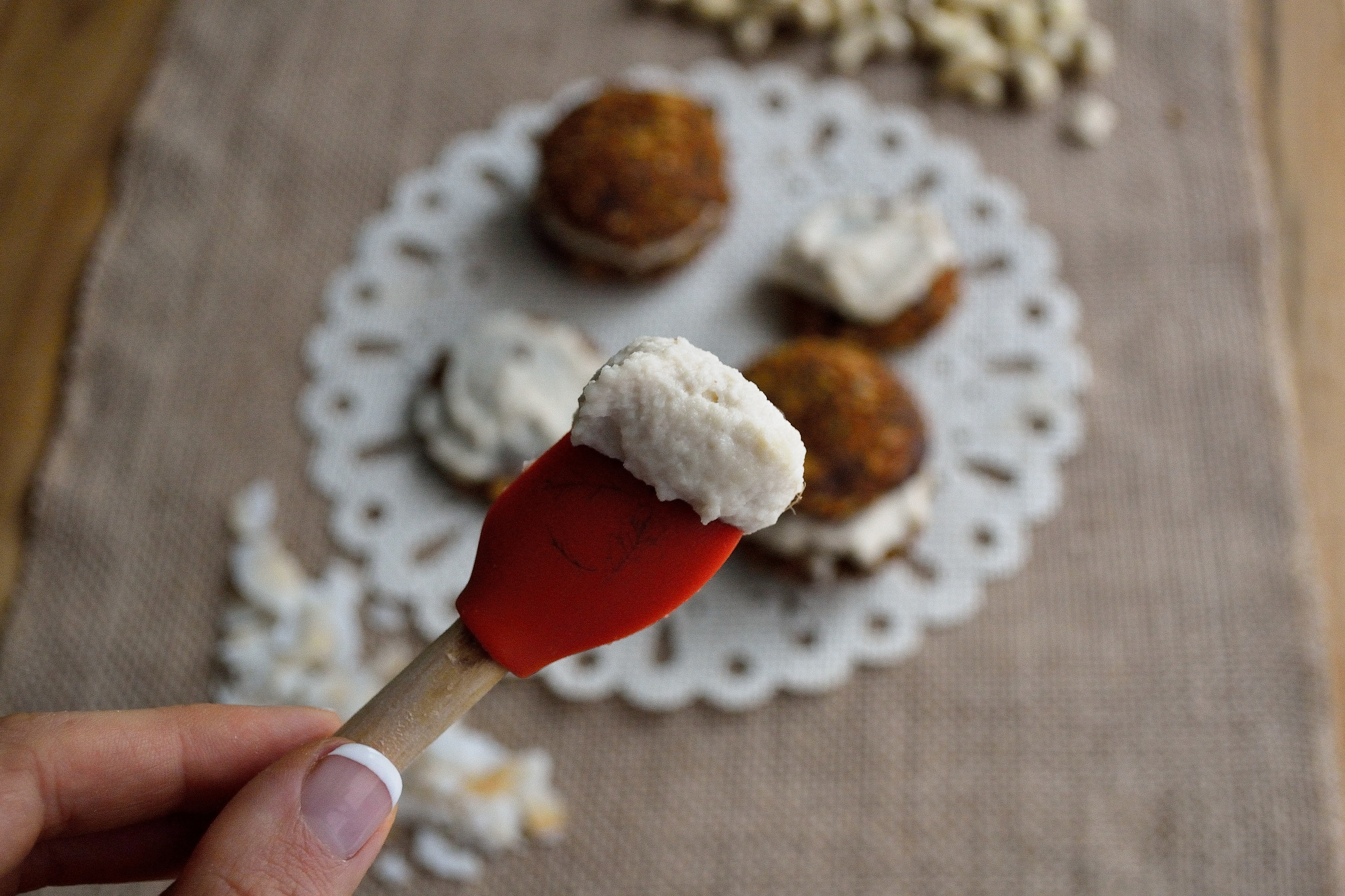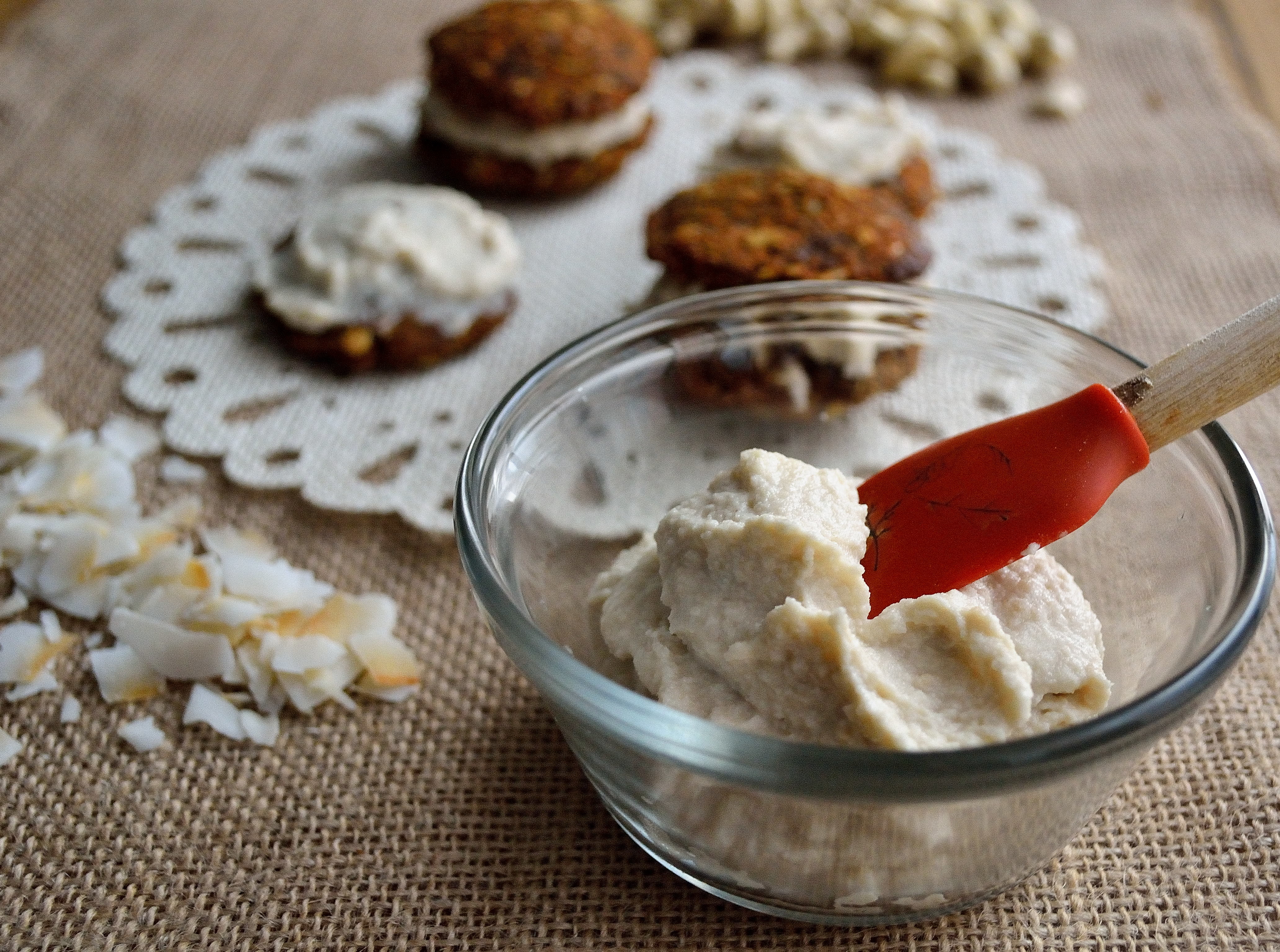 - Add the water and blend the cashews until you have a smooth cream. Add the coconut butter and blend to combine everything. Taste and see if you need to add more sweet or more tang.