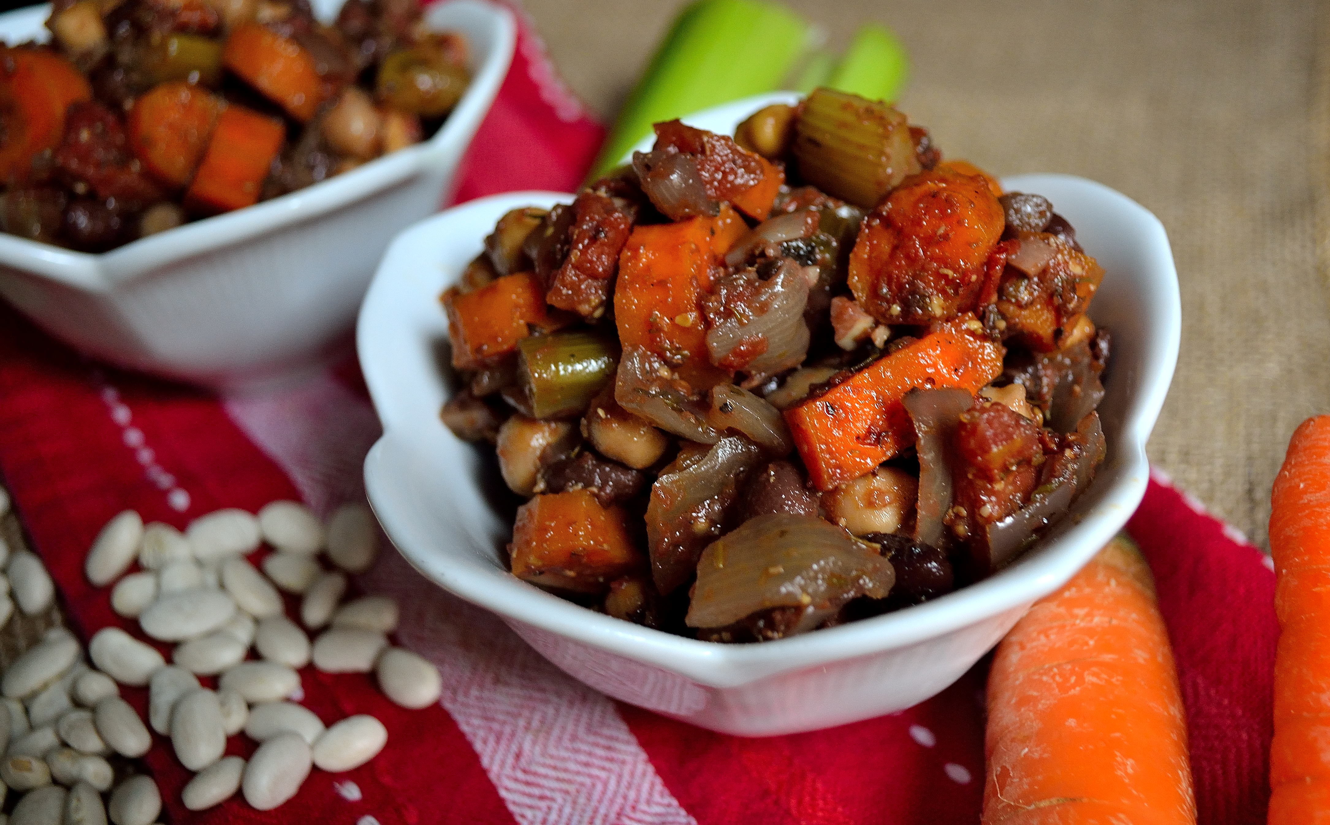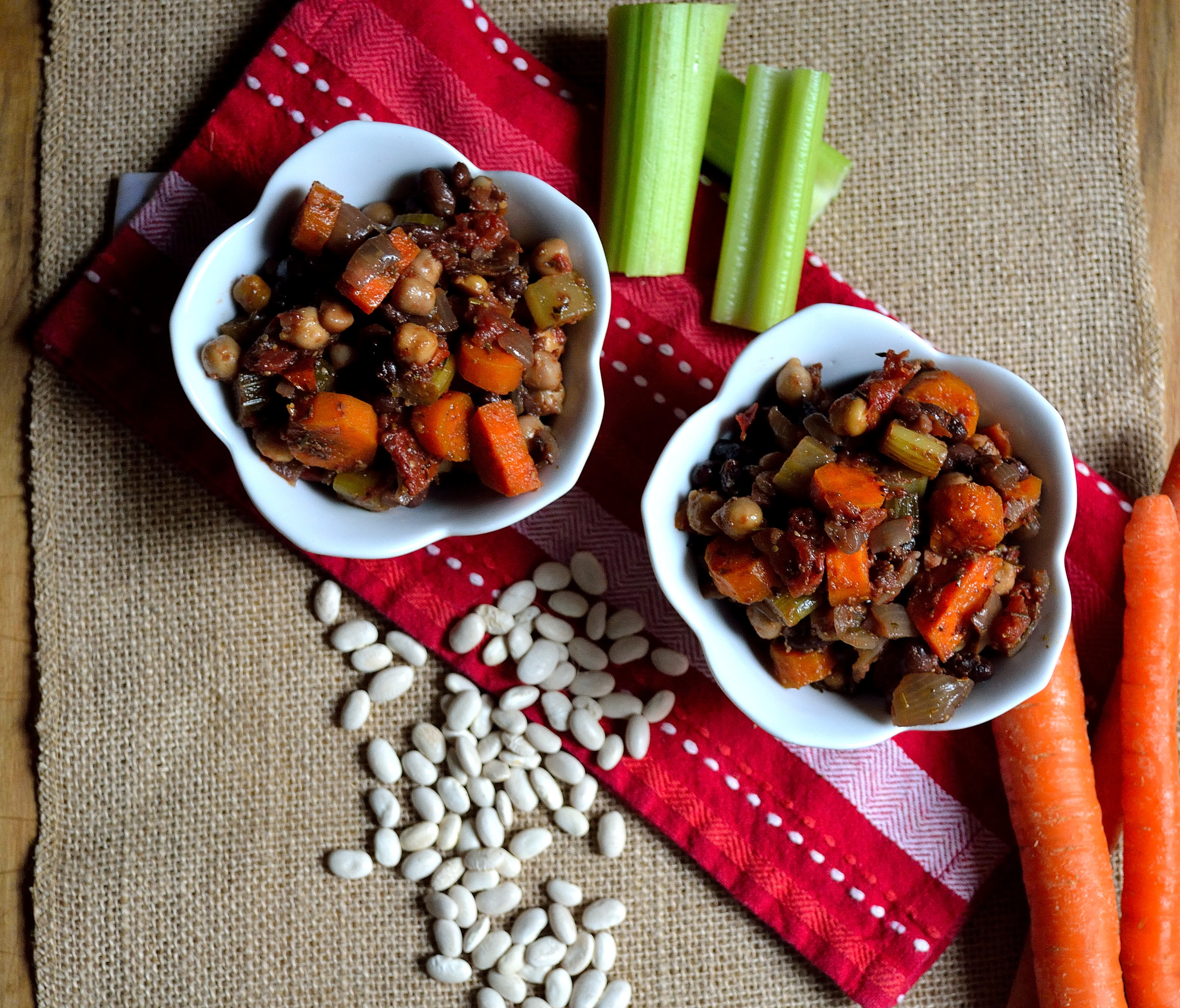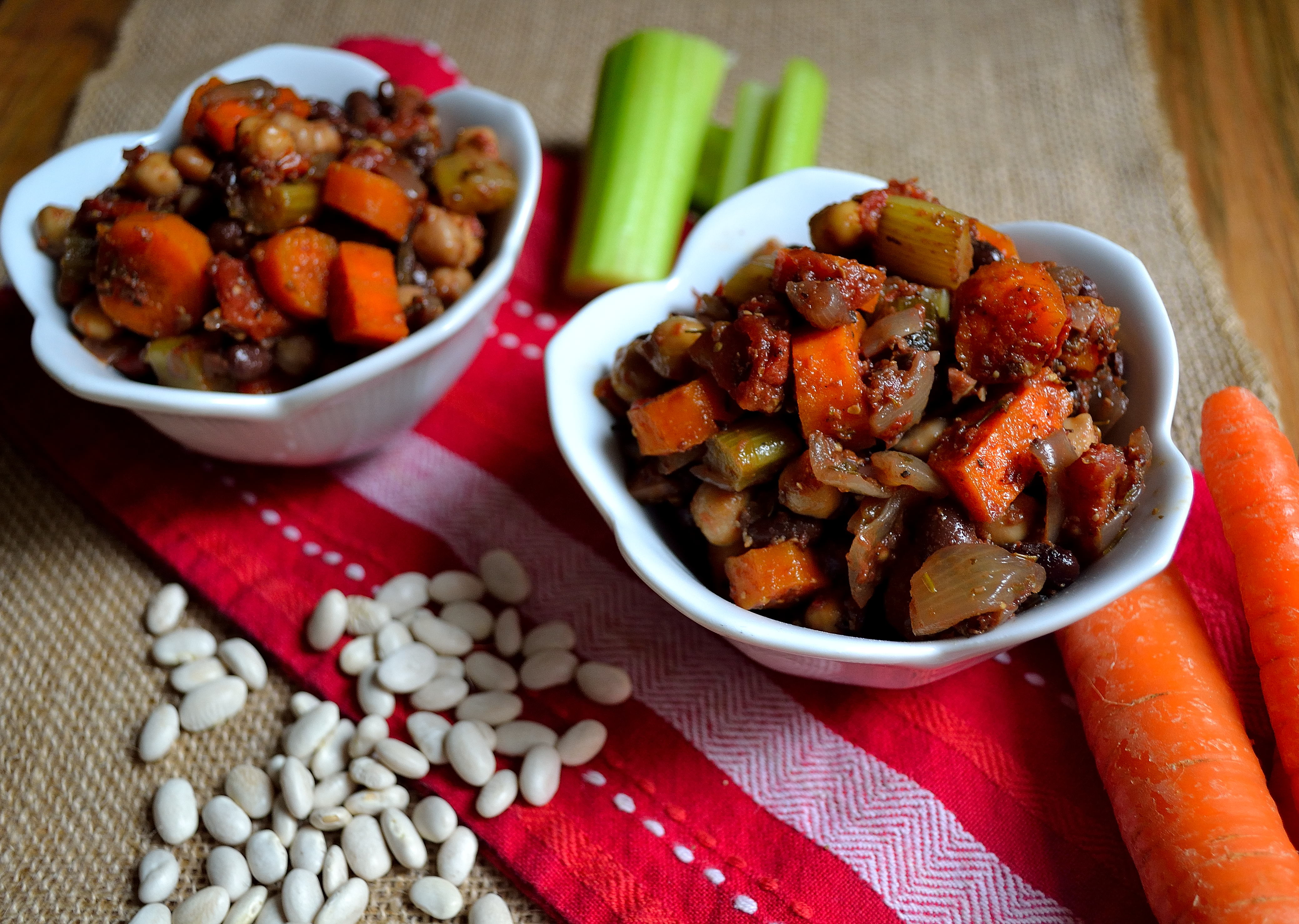 See? It really is a simple meal. After cooking in the oven for 45 minutes, you’re left with a meal that is stick to your ribs good and is loaded with good for you vegetables and legumes. If you want to do this meal with meat, I would use chunks of beef because they will handle the long cook time well. Just make sure to brown them before adding them into the dish.