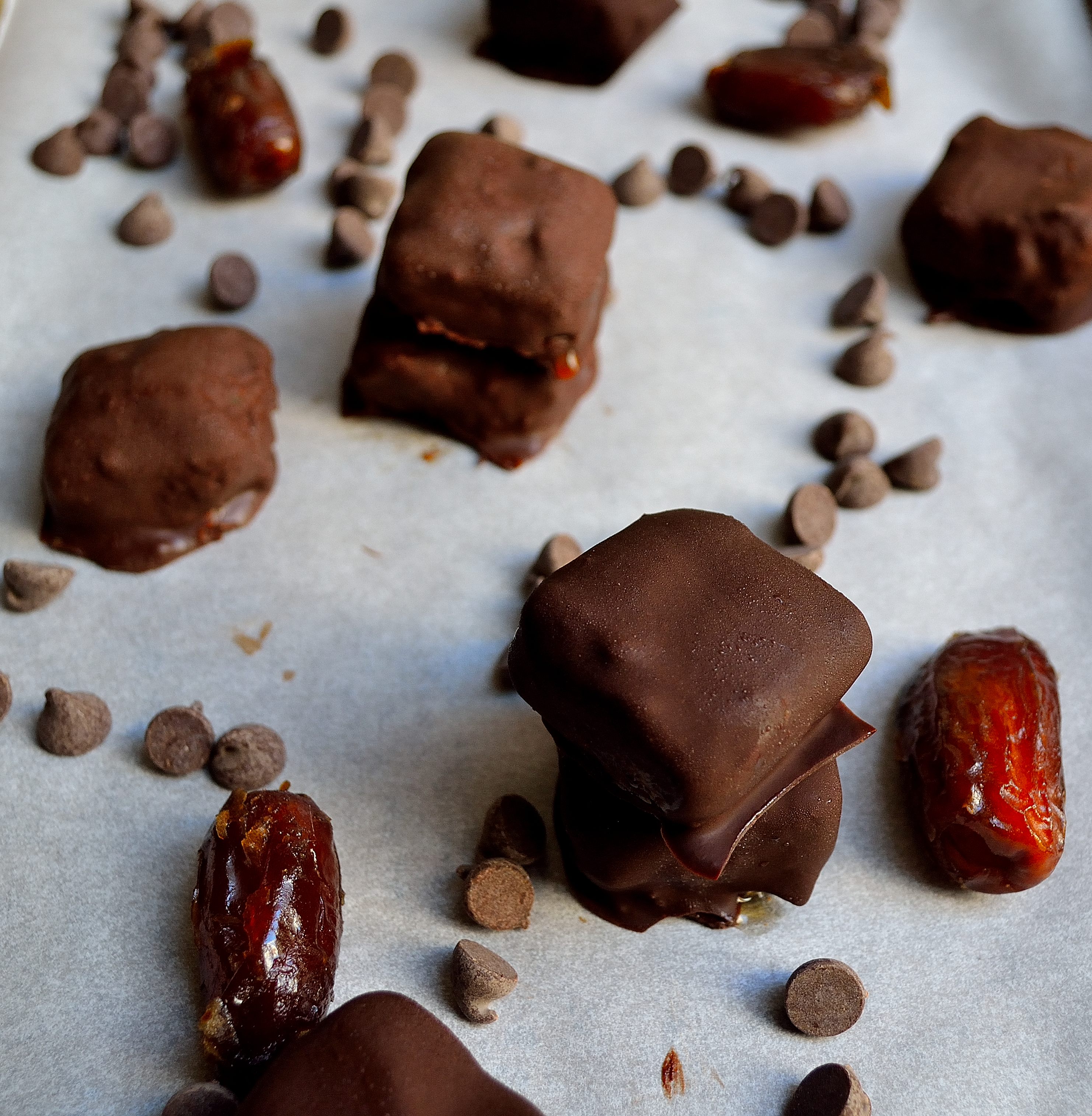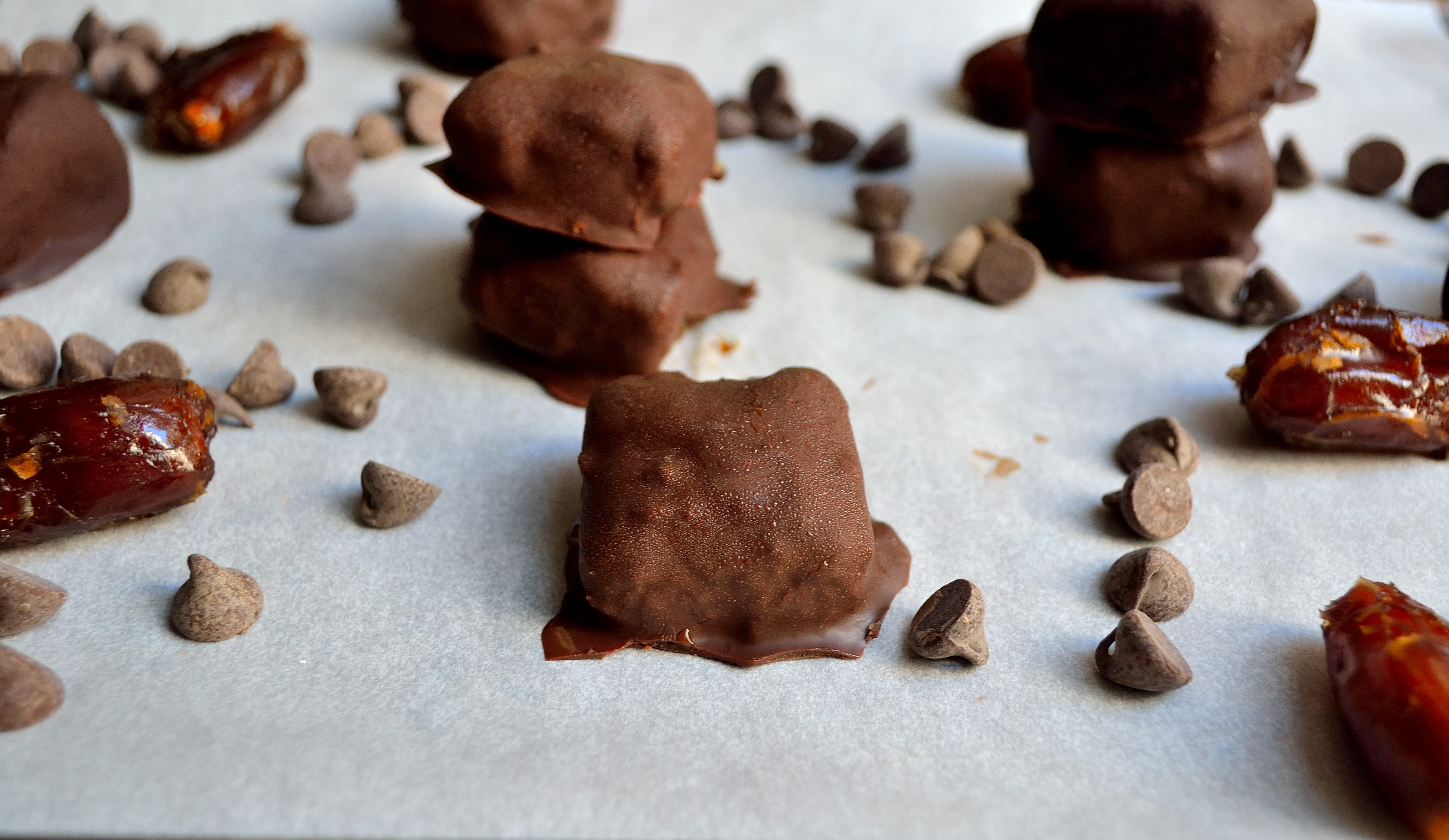 - Line a cookie sheet with parchment paper. Remove the frozen date caramel and pop them out of the molds. Using a fork, dip the caramel into the chocolate and place onto the cookie sheet, working quickly. Place the sheet into the freezer once they’re all covered